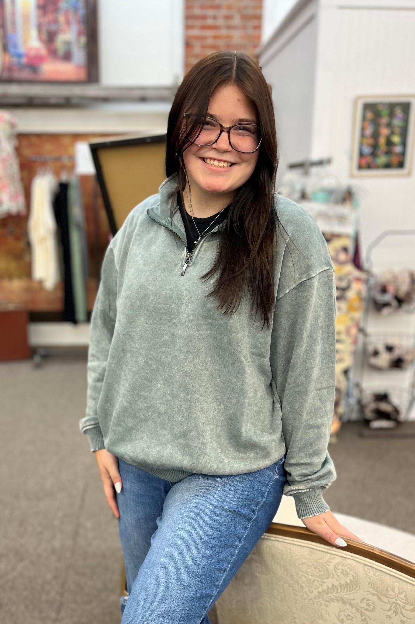 This quarter-zip sweatshirt brings a modern twist to classic comfort. Crafted in a washed sage green, it has a subtle, faded texture that gives it an effortless vintage vibe.