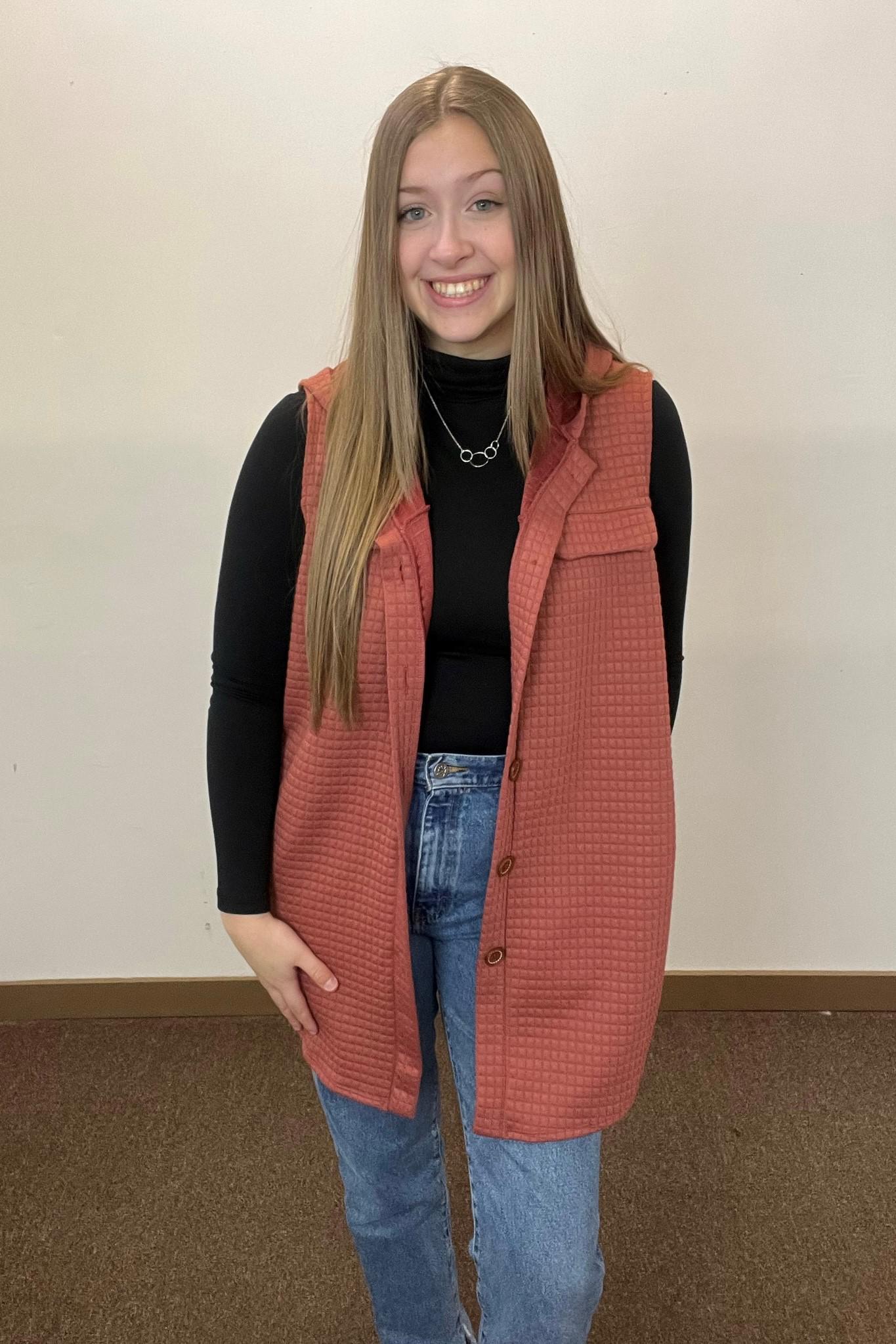 This quilted vest is the perfect transition piece for going into the holidays! With its longline cut, it is guarenteed to look great on everybody! It has a beautiful rust color that we just fell in love with right when we laid eyes on it!